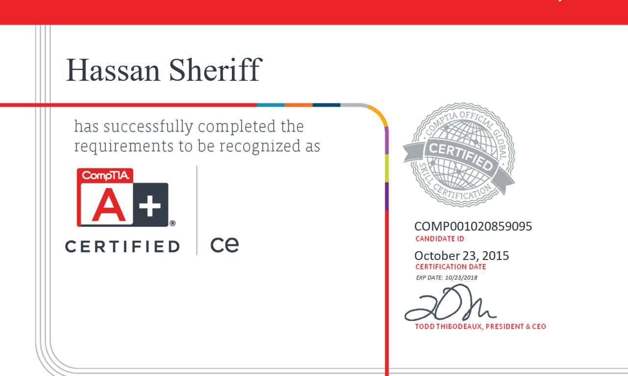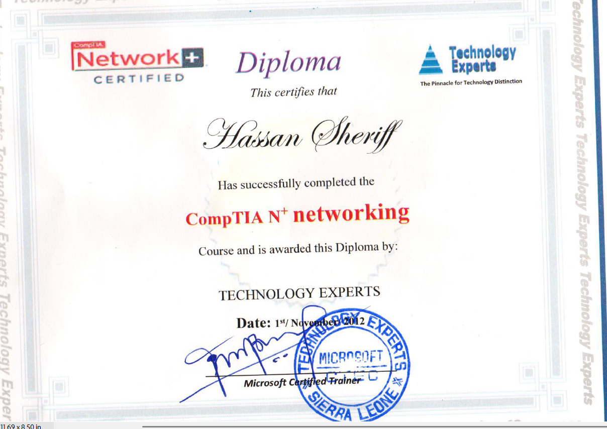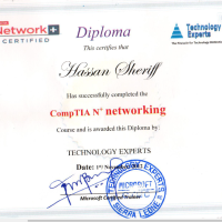 Hassan Sheriff, have successfully completed the CompTIA N+ networking course. You were awarded this diploma by
