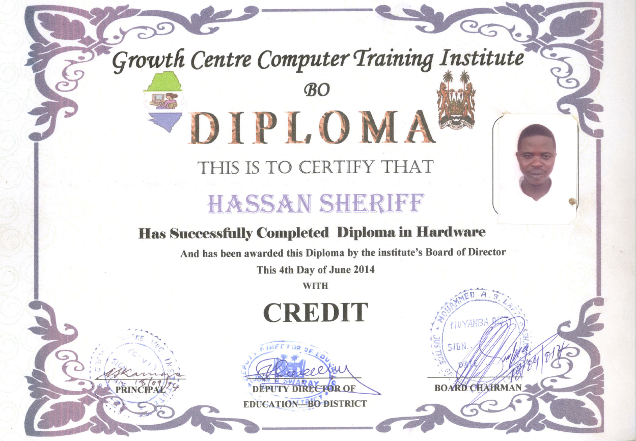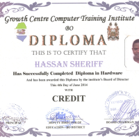Hassan Sheriff have successfully completed a Diploma in Hardware from the Growth Centre Computer Training Institute. The diploma was awarded with a credit, and the completion date is listed as June 4, 2014