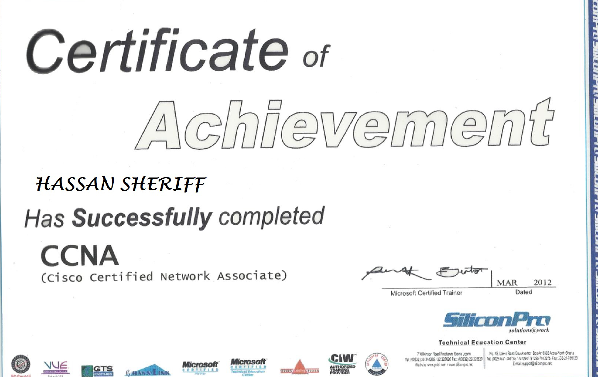 Certificate of Achievement for Hassan Sheriff from SiliconPro Technical Education Center. The certificate confirms that you have successfully completed the CCNA (Cisco Certified Network Associate) program. It is dated March 2012 and is signed by a Microsoft Certified Trainer.