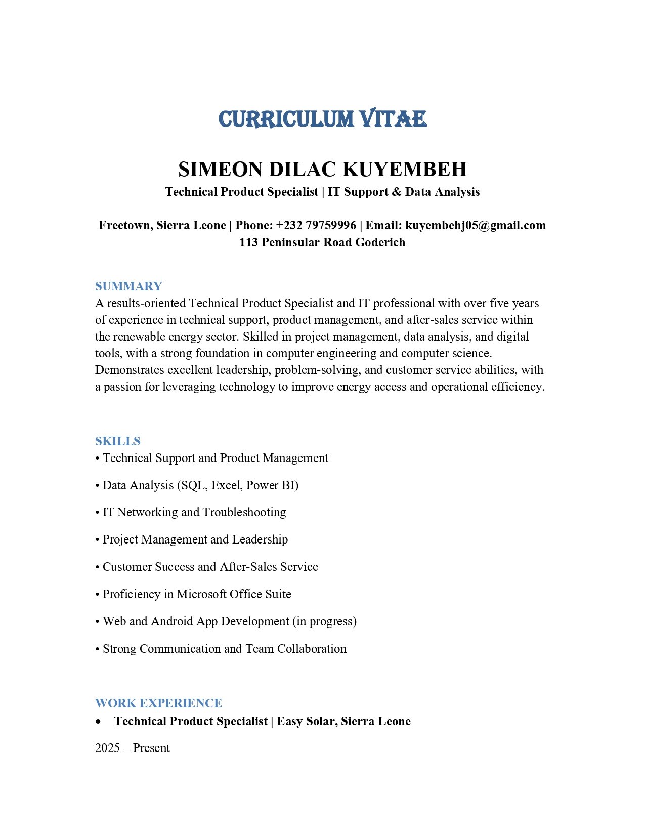 A results oriented Technical Product Specialist and IT professional with over five years of experience in technical support, product management, and after-sales service within the renewable energy sector. Skilled in project management, data analysis, and digital tools, with a strong foundation in computer engineering and computer science. Demonstrates excellent leadership, problem-solving, and customer service abilities, with a passion for leveraging technology to improve energy access and operational efficiency.