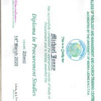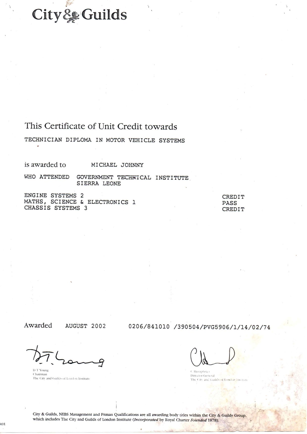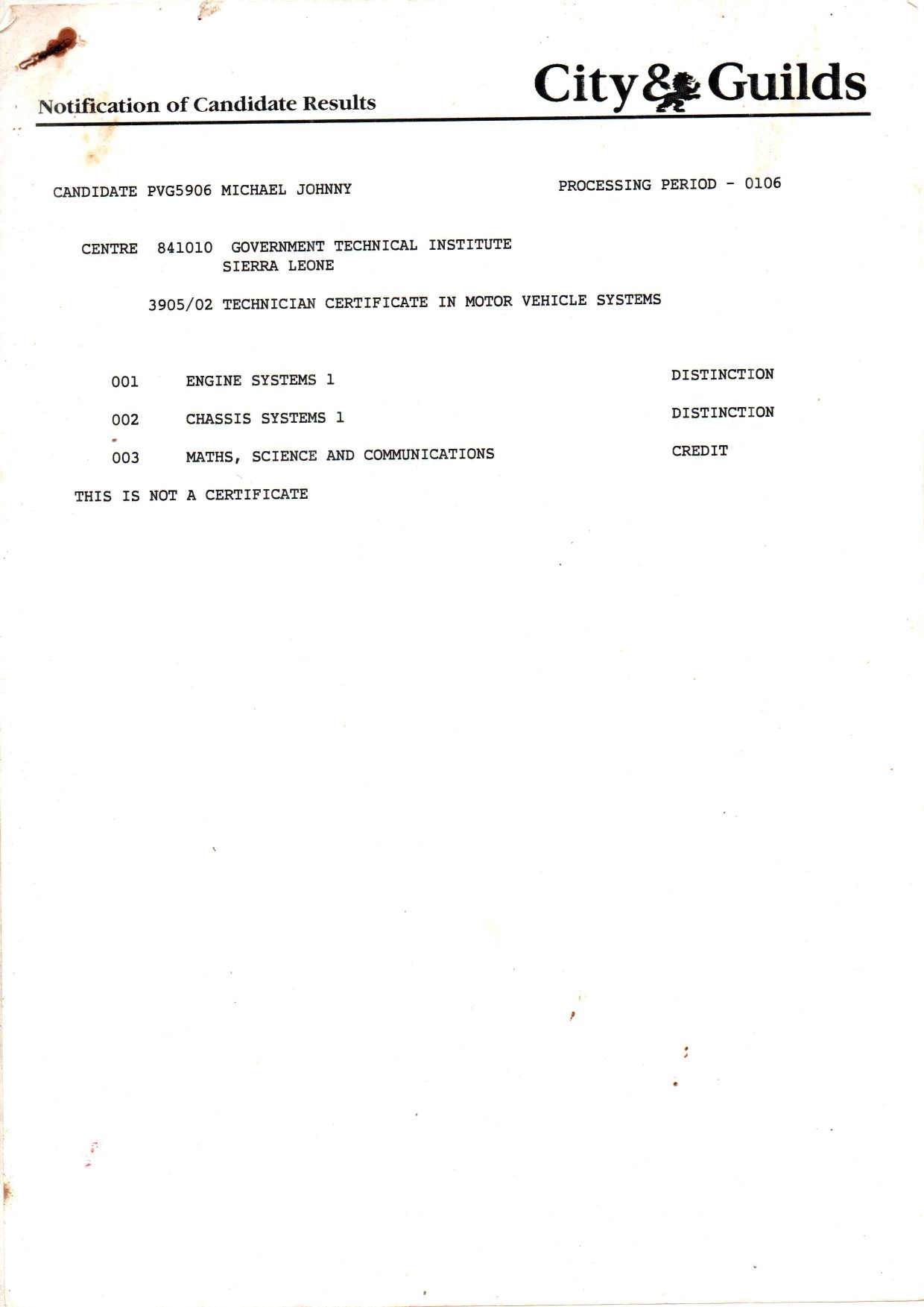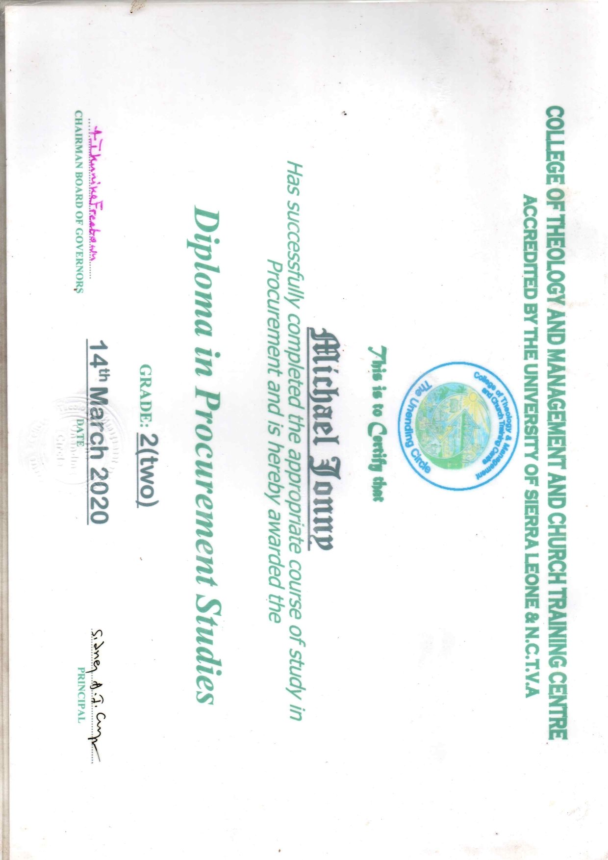 DIPLOMA IN PROCUREMENT STUDY, Technical Diploma – Motor Vehicle Engineering, Government Technical Institute (2002); rated Very Good in practical training.