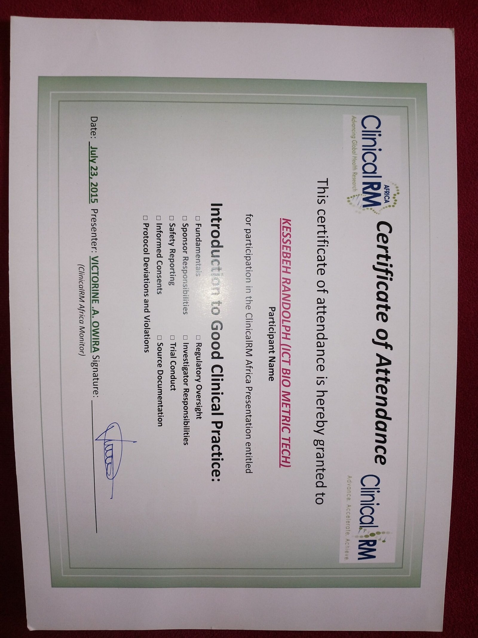 Cirtification in EBOVAC Salone Biometric Teachnicial, EBOVAC Salone MOTECH Operator, IT Security, The Global Health Network on GCLP: Method & System Velidation and also ICH: Good Clinical Practice (Clinical RM) 2015 to 2016