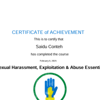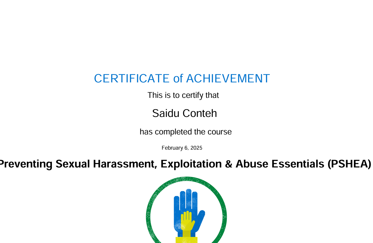 I hold a PSHEA (Protection from Sexual Harassment, Exploitation, and Abuse) certificate, which equipped me with the skills to recognize, prevent, and respond to incidents of sexual harassment, exploitation, and abuse within both organizational and community settings. This training emphasized safeguarding vulnerable populations, maintaining professional boundaries, and applying zero-tolerance principles in both field and office contexts.