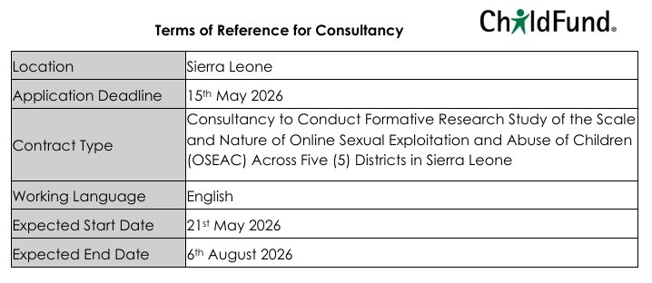 Interested consultant(s) should submit technical and financial proposals and all updated documents through the email: SierraLeoneProcurement@ChildFund.org and copy amassaquoi@childfund.org with email clearly marked with the title of “Formative Research Assessment of the Scale and Nature of Online Sexual Exploitation and Abuse of Children (OSEAC) Across Five (5) Districts in Sierra Leone”. Only applicants with complete documents will go through the selection process and only shortlisted applicants will be contacted